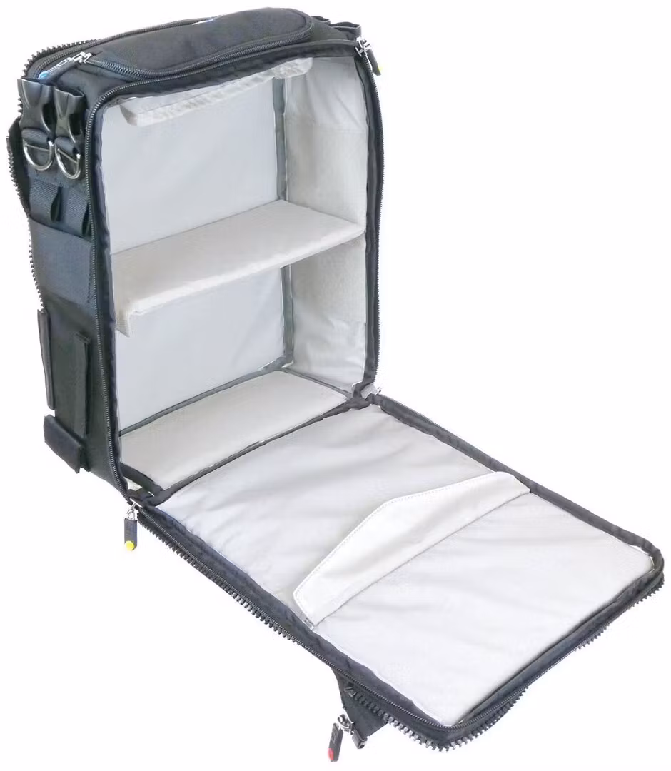 The CS5 also comes with a divider shelf that is attached to the sidewalls of the compartment by use of Velcro on each end.  The velcro panels on the bag walls are quite large which allows you to move the divider shelf up and down to position the shelf right where you need it for your stuff (or take it completely out if you need). If you have the divider shelf installed, and if you're accessing the bag only from the top access, you won't (of course) be able to get those items underneath the divider shelf. To remedy this situation, (we did think of this occurance) we made it so that you can also zip open the entire rear panel of the module, thereby allowing you to grab all of the items inside, both above and below the divider shelf.  So the CS5 has both top AND side access.  Pretty cool.