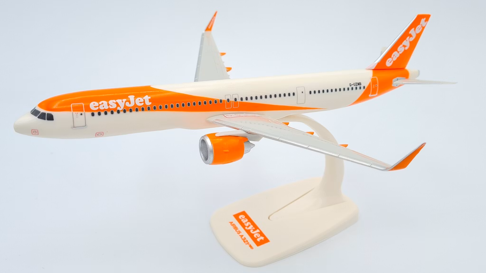 Flygplansmodell av plast som enkelt monteras ihop. Airbus A321 NEO, med CFM Leap-1A motorer och Easyjets färgschema.