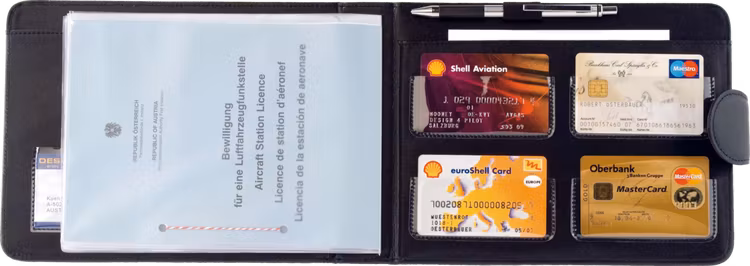 Denna pilotloggbok är också lämplig för inbundna loggböcker. Fyra ytterligare fickor ger plats för bränslekort, kreditkort etc. och det finns också en elastisk pennhållare.